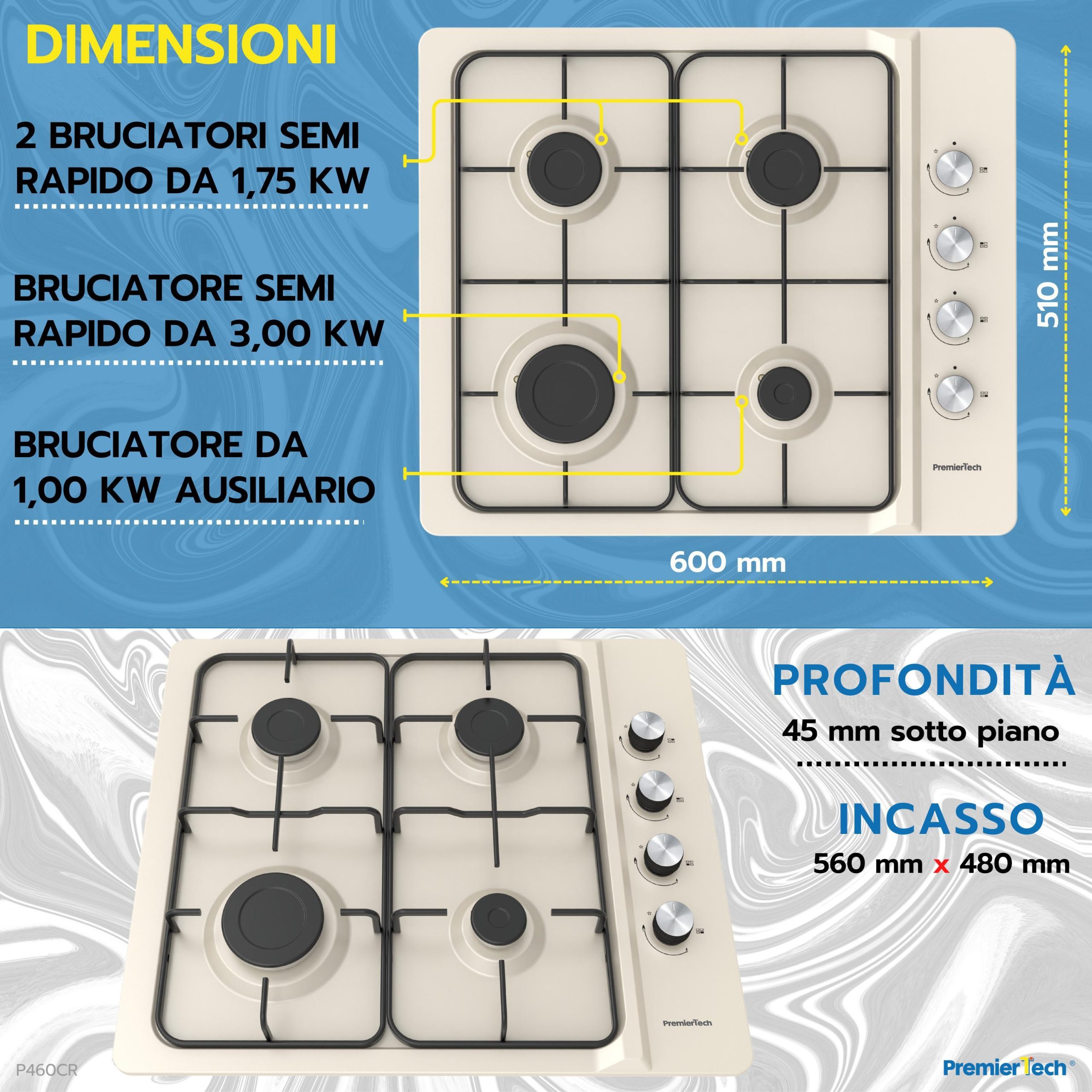 Tipo di Bruciatori | Bruciatori di alta qualità – 1 Bruciatore rapido da 3.00 kW, 2 Bruciatori Semi rapidi da 1.75 kW, 1 Bruciatore ausiliario da 1.0 kW |